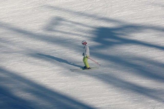 12月22日,新疆阿勒泰地区富蕴县,可可托海外洋滑雪度假区,滑雪深嗜者在雪说念上留住飘逸光影。中青报·中青网记者 谢洋/摄